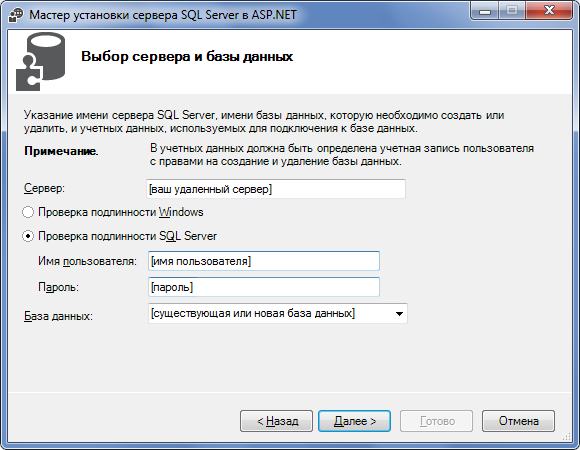 Если в поле База данных оставить значение <по умолчанию> (<default>), то мастер будет использовать базу данных с именем aspnetdb. Если на указанном сервере её не существует, мастер создает ее, и в ней необходимые таблицы.