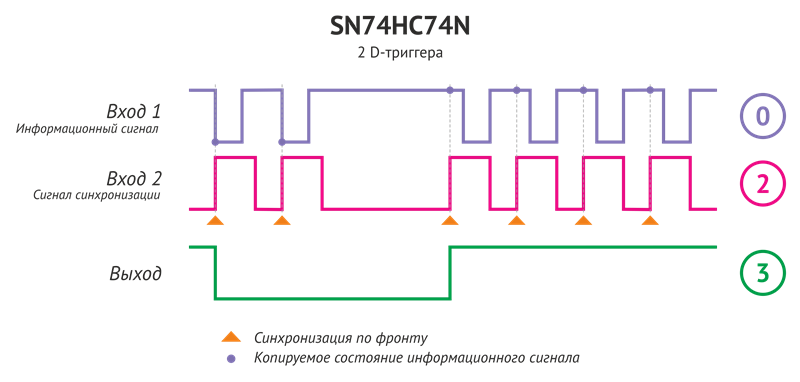 По восходящему фронту сигнала синхронизации, триггер принимает состояние информационного сигнала и сохраняет его до тех пор, пока не придет новый сигнал синхронизации. Для того чтобы понять как работает D-триггер, достаточно посмотреть на сигнал в точке 3: |