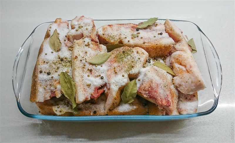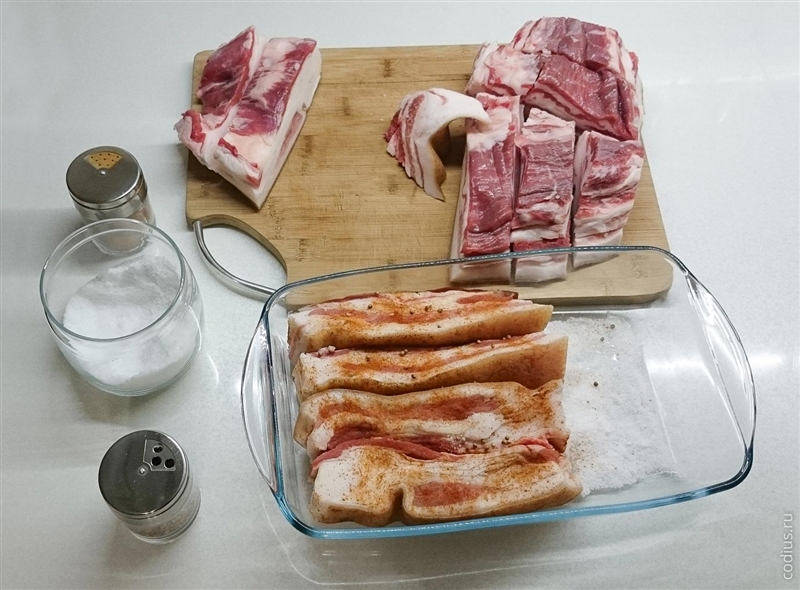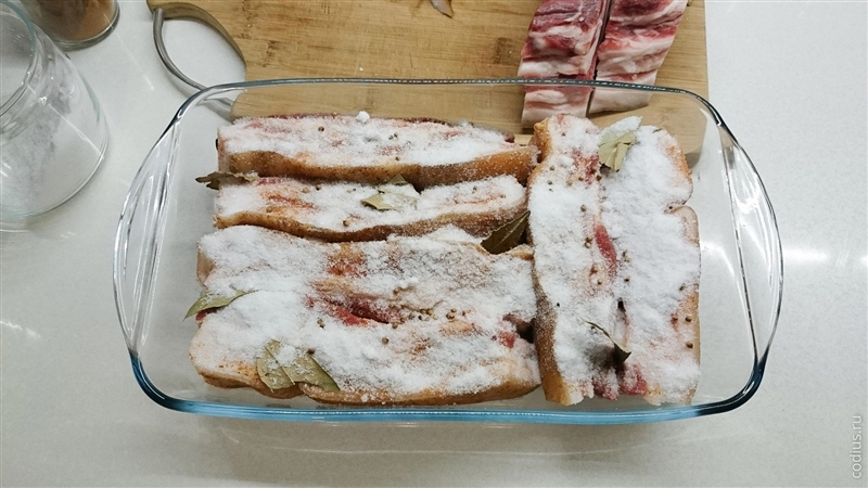 Устоявшееся мнение, что в приготовлении засоленного сала соли много не бывает, работает только для сала без прослойки — мясная прослойка прекрасно впитывает соль — следует очень аккуратно её (соль) дозировать.