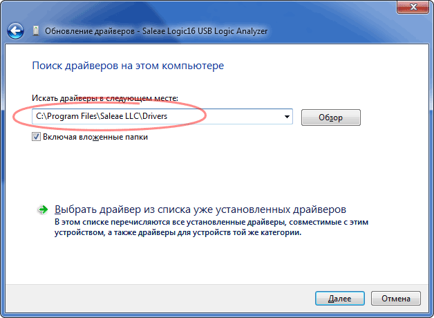 Если все таки драйвер не нашелся автоматически, системе можно подсказать — драйвера располагаются в папке с установленной программой (по умолчанию C:\Program Files\Saleae LLC\Drivers): |