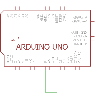 Получается, что 8 пин находится в неопределенном «подвешенном» состоянии и при считывании его значения нельзя определенно сказать, в каком он состоянии — HIGH или LOW. Такое состояние ещё называется высокоомным состоянием или состоянием Z. А провод, соединяющий пин платы с кнопкой, выполняет роль антенны для различных электромагнитных наводок. Именно эти наводки и заставляют контакт вести себя непредсказуемым образом. Для того чтобы устранить эту ситуацию, необходимо сделать так, чтобы в любом состоянии кнопки на 8 пине было однозначное значение. Для этого скорректируем схему следующим образом — подключим пин 8 к земле через резистор номиналом 10 КОм: |