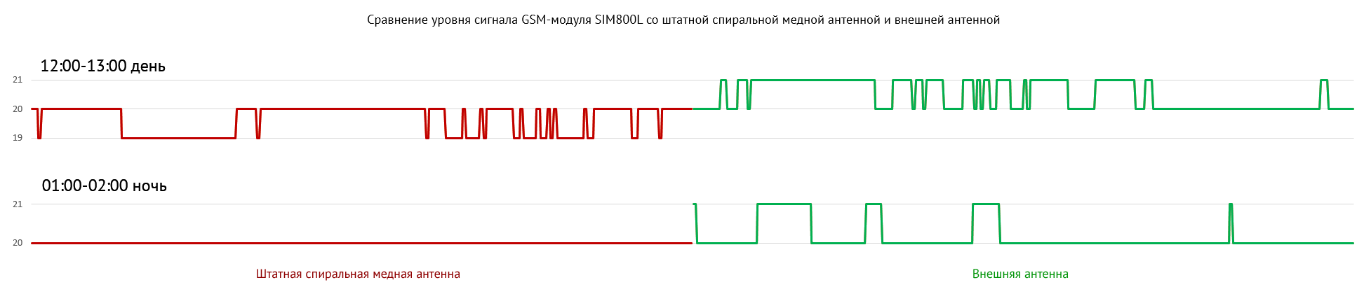 Из графика видно, что внешняя антенна действительно улучшает сигнал. К сожалению, не удалось протестировать антенну в зоне неуверенного приема. Исходя из описания команды уровень нормального сигнала находится в диапазоне от 10 единиц, до 31. Качество сигнала в 20 единиц, является отличным результатом. Но в любом случае результат очевиден. |