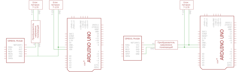 Нельзя запитывать модуль SIM800L от Arduino. Дело в том, что датчик бывает очень прожорлив (по даташиту максимальное потребление тока достигает $2 А$). А, как известно, Arduino не в состоянии обеспечить его таким током, поэтому очень вероятен сбой в работе — будет работать некорректно или модем, или Arduino, или оба вместе взятые (вполне вероятен выход Arduino из строя). Здесь может быть 2 выхода — либо SIM800L обеспечивается своим отдельным питанием (при этом земля GND обоих источников должна быть общая), либо и Arduino, и GSM-модуль запитываются одним мощным источником питания ($7-12 В$). |