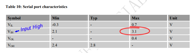 Даташит (2,94 MB) модуля, в характеристиках Serial-порта, недвусмысленно говорит о максимальном уровне логической единицы на входе RX — 3,1 В (при минимальном 2,1 В): |