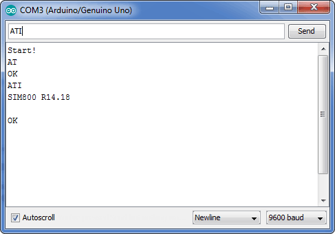 Теперь, когда параметр Newline установлен (каждая команда с новой строки), можно отправлять команды через поле Serial-порта. Если отправить команду ATI, можно получить информацию о версии модуля: |