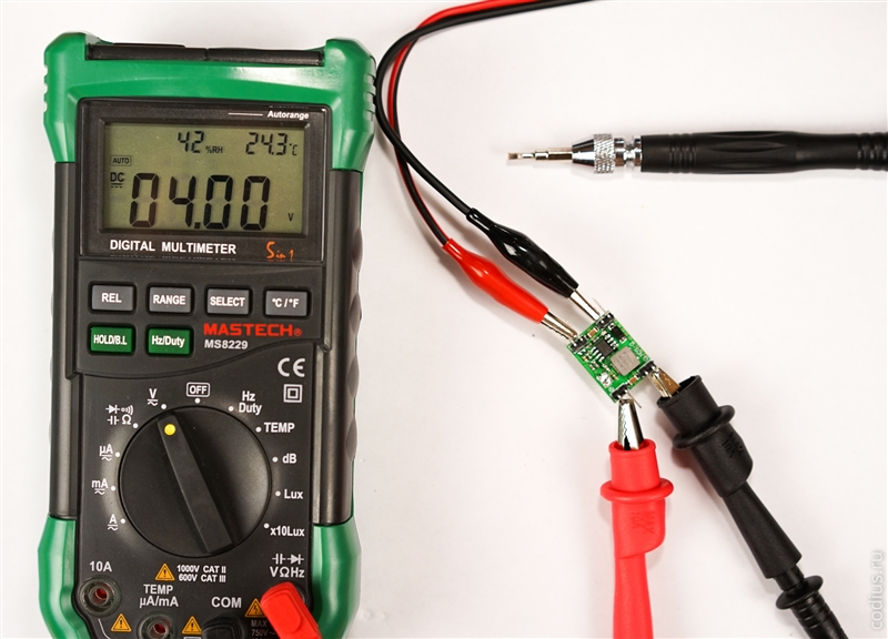 Перед подключением модуля к преобразователю напряжения, необходимо, при подключенном к преобразователю источнике питания, при помощи мультиметра установить заданное выходное напряжение: |