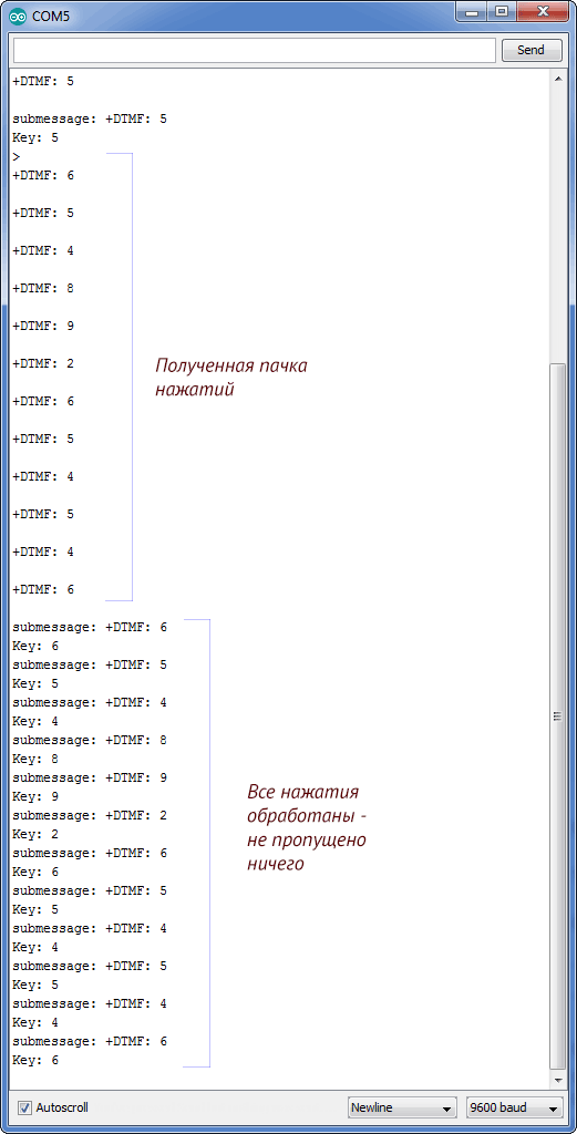 Второй способ предполагает обработку полученного уведомление именно как пачку незапрашиваемых ответов, а не как один ответ. Исходя из этого скорректируем процедуру loop() следующим образом. В скетче для удобства создана дополнительная функция для обработки логики DTMF processingDTMF(): |