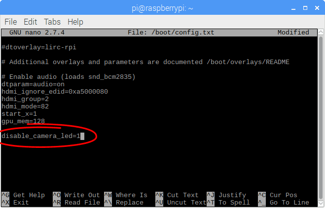 1 sudo nano /boot/config.txt Нужно добавить строку: 1 disable_camera_led=1 После — сохранить файл config.txt и перезагрузить Малинку |