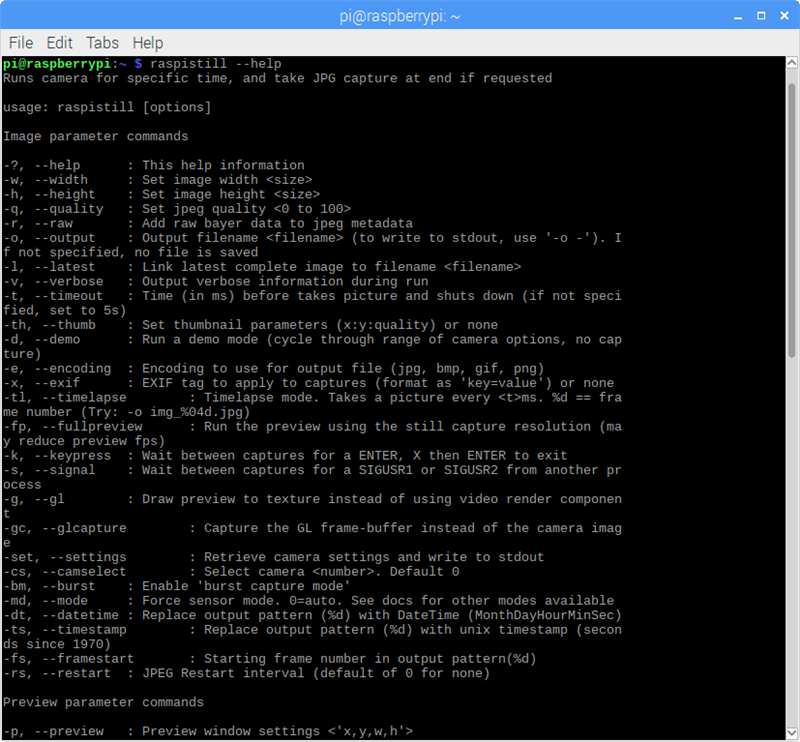 Полный список параметров для каждой утилиты можно получить, если выполнить утилиту без параметров 1 raspistill либо выполнить утилиту с параметром --help: 1 raspistill --help |