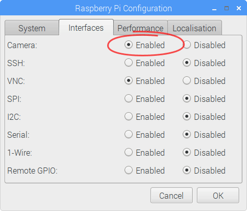 Подключив камеру к Малинке, в настройках Raspberry OS (Preferences → Raspberry Pi Configuration) необходимо включить возможность использования камеры — вкладка Interfaces пункт Camera кликнуть на Enabled. |