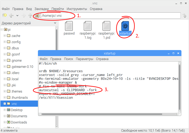 После этого её можно запускать вручную командой autocutsel, а можно добавить в файл запуска VNC-сервера, чтобы утилита запускалась вместе с ним. Для этого в файл /home/pi/.vnc/xstartup нужно добавить строку autocutsel -s CLIPBOARD -fork: