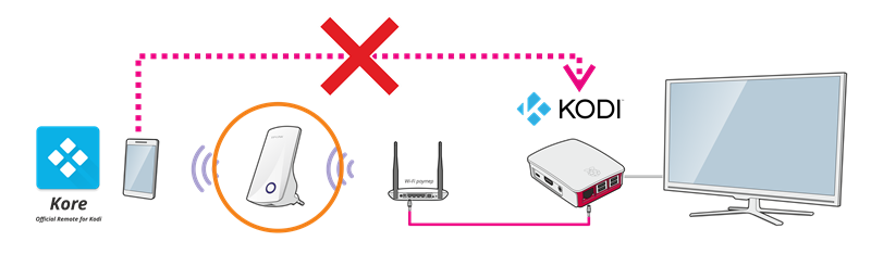 В процессе эксплуатации была выявлена невозможность подключения приложения Kore к KODI, в случае если смартфон был подключен к сети через ретранслятор (усилитель, TP-LINK TL-WA850RE) Wi-Fi сигнала. Когда он исключался из сети все работало отлично.