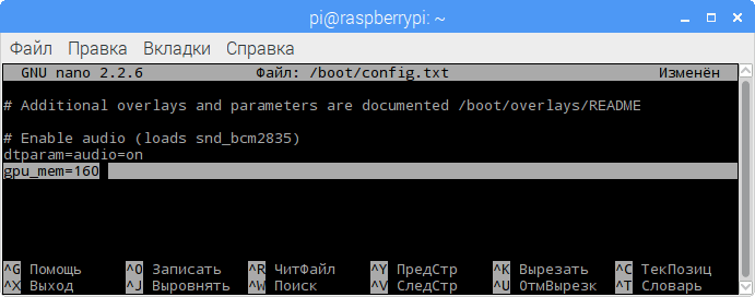 Она позволит корректно проигрывать FullHD-видео при 160 Мб GPU. Как уже упоминалось выше, размер выделяемой памяти можно указывать здесь же, в файле /boot/config.txt — строка gpu_mem=160.