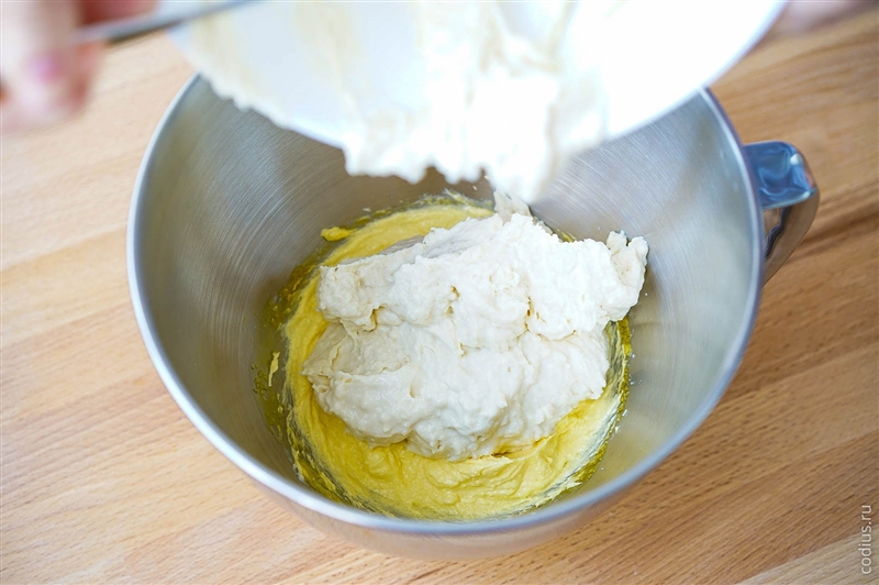 Добавляем муку с молоком в масляно-сахарную смесь, перемешиваем. |