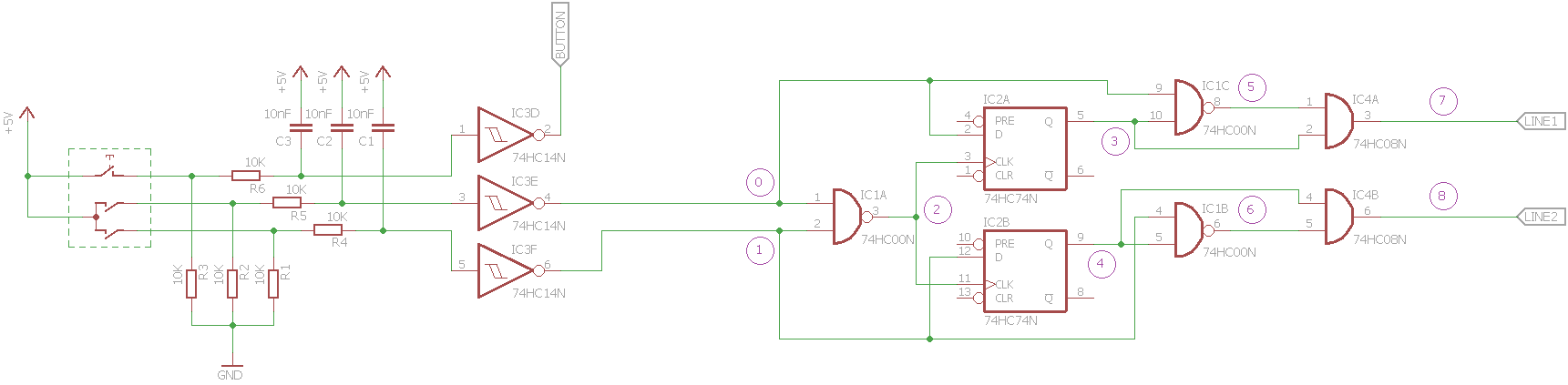 Сделать без участия микроконтроллера (на микросхемах ТТЛ-логики) так, чтобы вращение энкодера конвертировалось в положительные импульсы на двух разных выходах — по часовой стрелке на одном выходе, против часовой — на другом, таким образом имитируя нажатия двух отдельных кнопок: