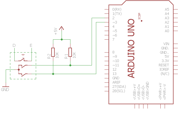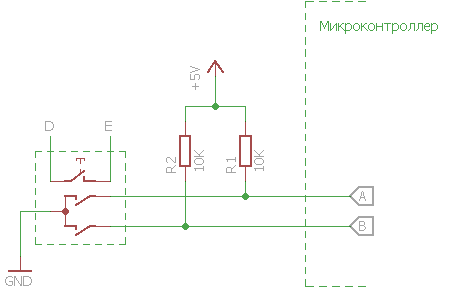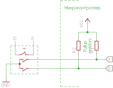 При подключении энкодера к МК со встроенными подтягивающими резисторами, их можно исключить из схемы, не забыв при этом включить встроенные подтягивающие резисторы: |