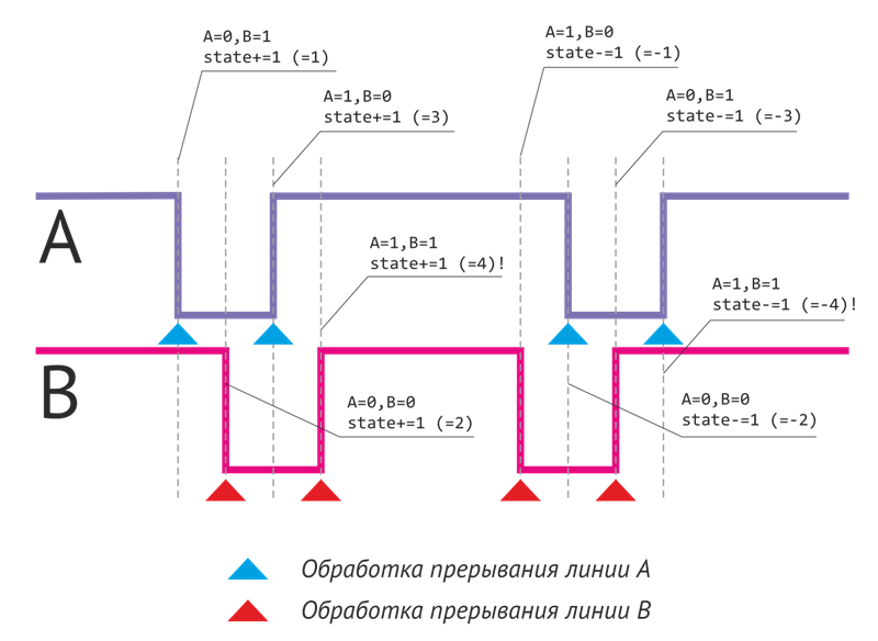 Схематично работу инкрементального энкодера можно представить следующим образом: |