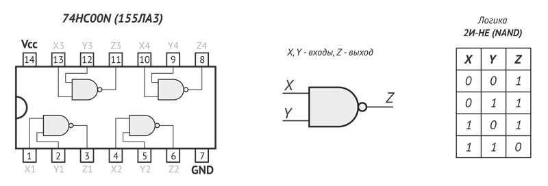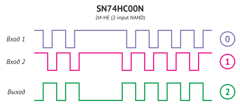 Результат работы этой микросхемы можно описать так — логический ноль на выходе будет, только когда на обоих входах будет логическая единица. Результат: |