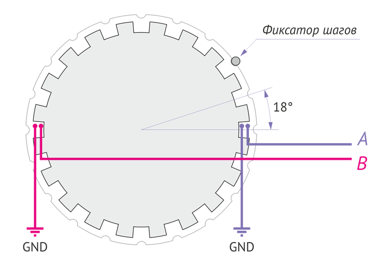 Каждый инкрементальный энкодер имеет следующую основную характеристику — дискретность (количество шагов, положений между импульсами, на один оборот вала). Благодаря дискретности, можно вычислить угол единичного изменения положения. В нашем примере, энкодер ЕС11 за полный оборот генерирует 20 серий импульсов. А это значит, что каждый шаг эквивалентен повороту на 18°. Помимо этого, вал энкодера фиксируется в каждом положении между каждой серией импульсов. |