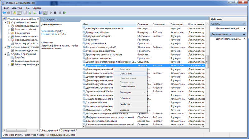 Что предпринять Первое, что нужно сделать — остановить службу Диспетчер печати (Windows 7) / Диспетчер очереди печати (Windows XP). Кнопка Пуск, далее правой кнопкой мыши на Компьютер -> Управление -> Службы -> Диспетчер печати -> Остановить: |