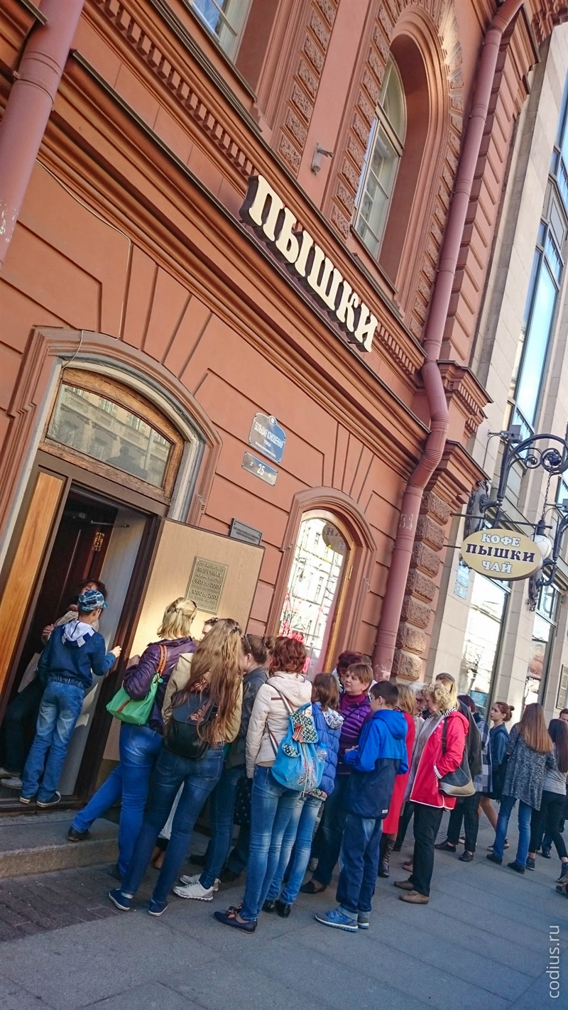 Почему-то в Пышечной можно купить только кофе со сливками (его, кстати, приносят в эмалированных ведрах) — чай здесь под запретом! Но, как видно на фото, именно все это и притягивает посетителей. Очень удобно взять с собой в пакете пышки и посидеть, поесть их на лавочке неподалеку, запивая чаем из прихваченного из дома термоса. |