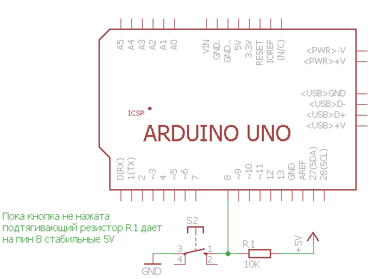 Получается, что 8 пин находится в неопределенном «подвешенном» состоянии и при считывании его значения нельзя определенно сказать, в каком он состоянии — HIGH или LOW. Такое состояние ещё называется высокоомным состоянием или состоянием Z. А провод, соединяющий пин платы с кнопкой, выполняет роль антенны для различных электромагнитных наводок. Именно эти наводки и заставляют контакт вести себя непредсказуемым образом. Для того чтобы устранить эту ситуацию, необходимо сделать так, чтобы в любом состоянии кнопки на 8 пине было однозначное значение. Для этого скорректируем схему следующим образом — подключим пин 8 к земле через резистор номиналом 10 КОм: |