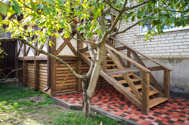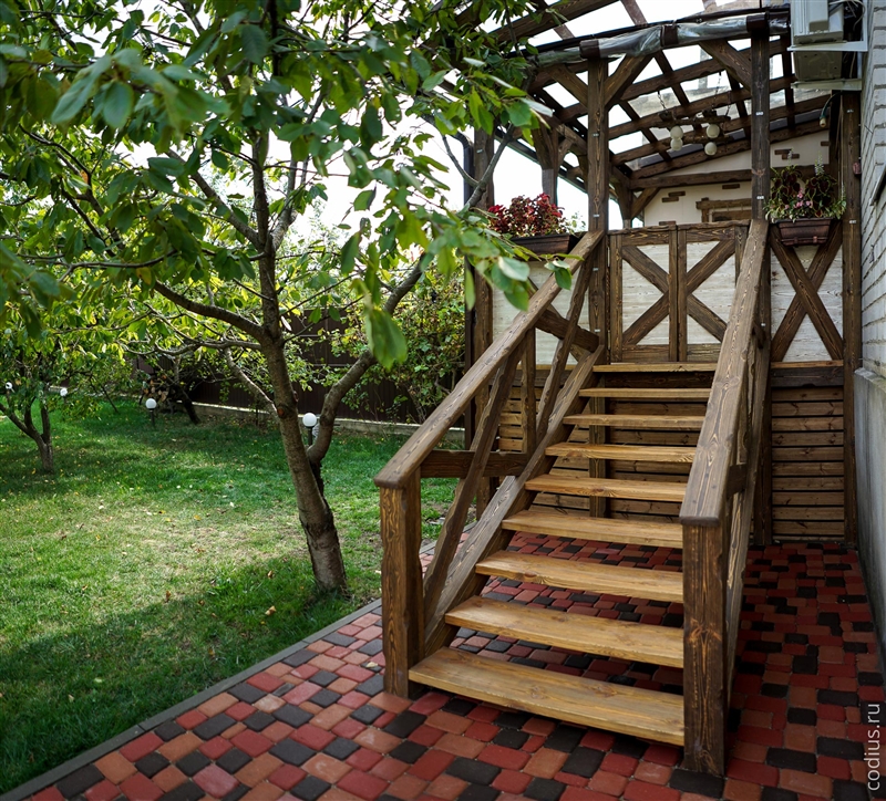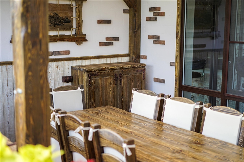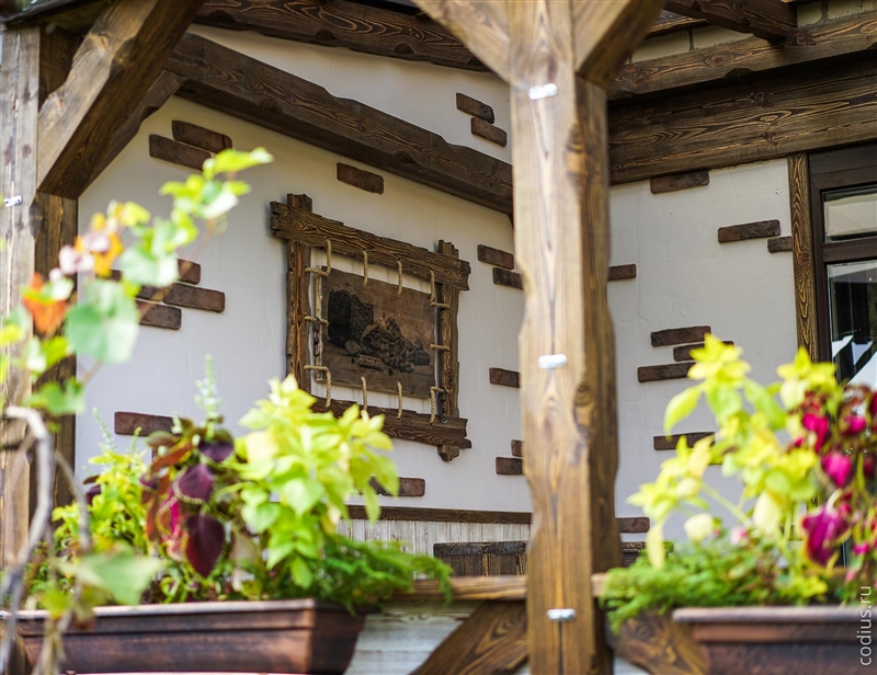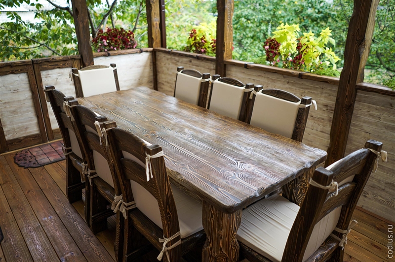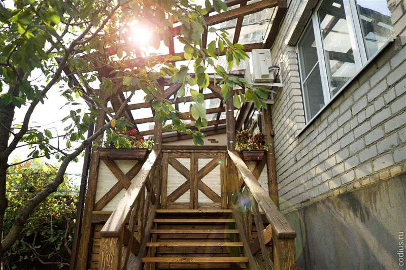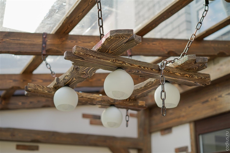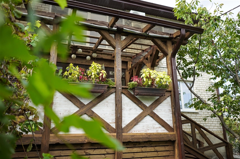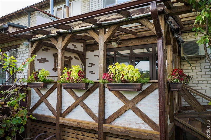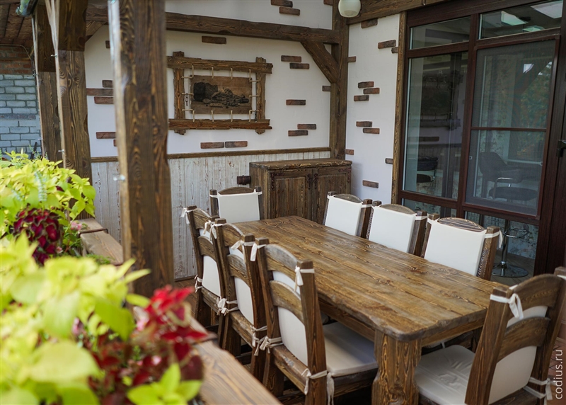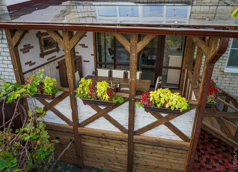 Было принято одно из самых удачных решений — крыша сделана из монолитного четырехмиллиметрового поликарбоната — веранда очень светлая, и сидеть под дождем одно удовольствие. В то же время монолитный поликарбонат очень прочный и способен выдержать даже крупный град: