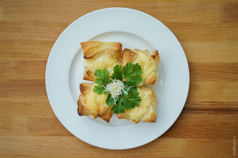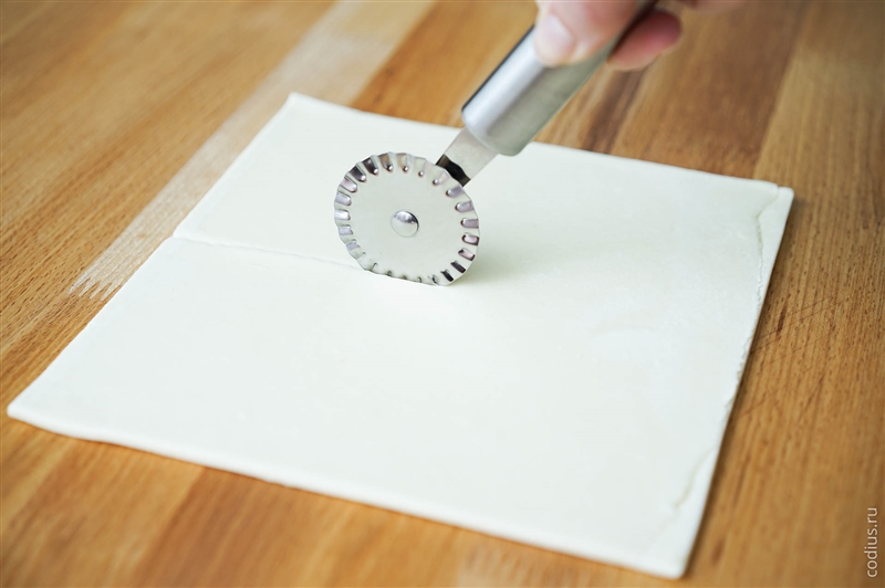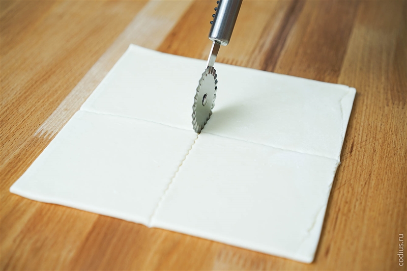 Разрезаем слоеное тесто на 4 части. |