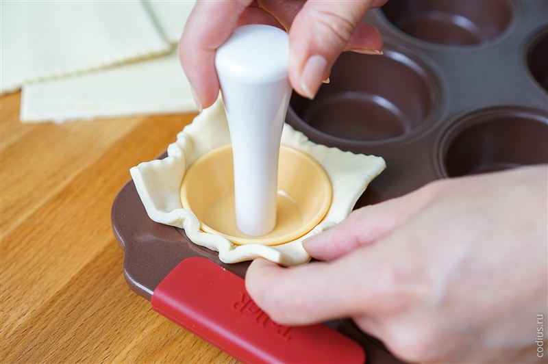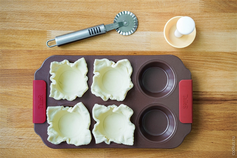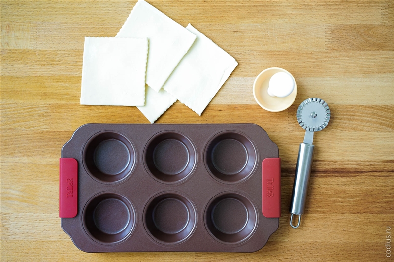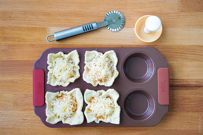 Берем форму для маффинов/кексов (можно даже бумажные формы, но которые держат форму) и укладываем в неё квадраты теста. |
