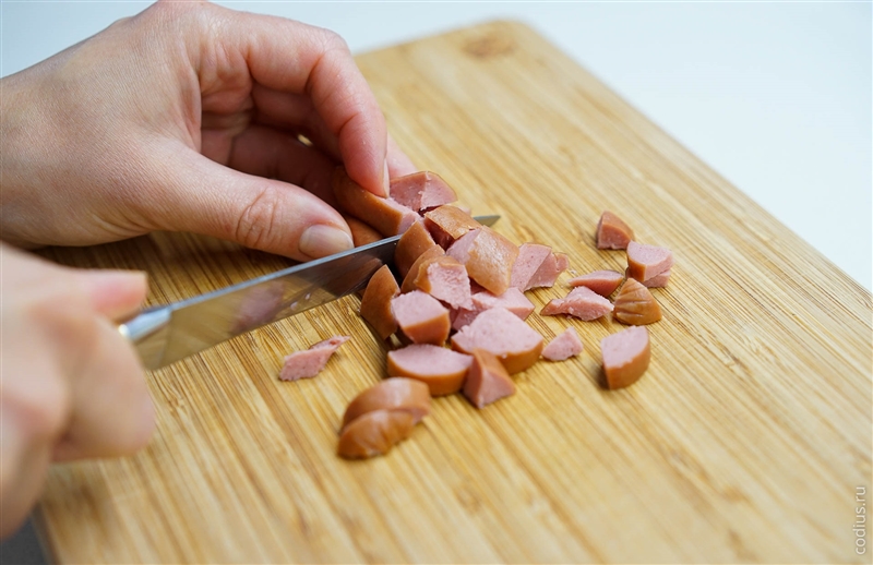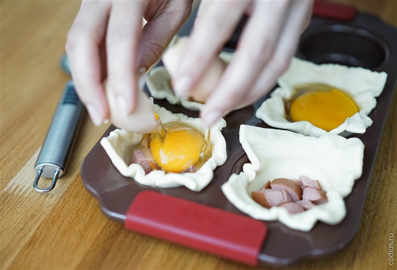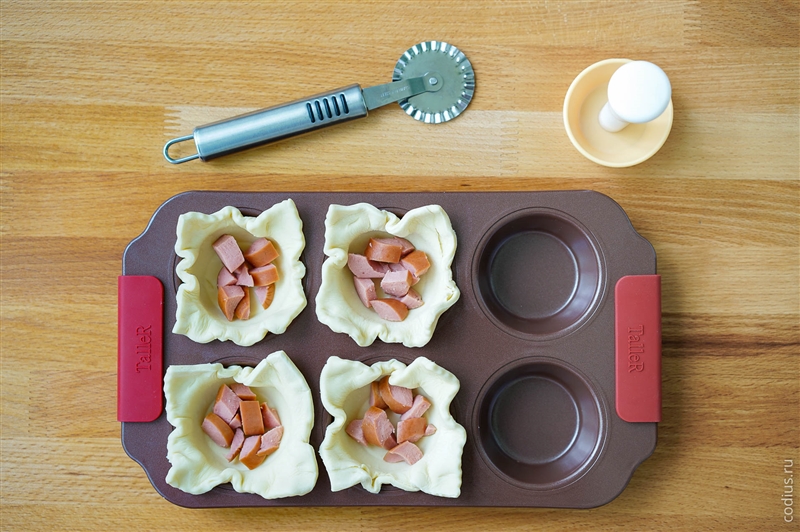 Предварительно отваренную сосиску нарезаем на кусочки и укладываем в получившиеся корзинки из теста. |