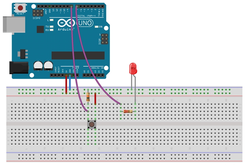 Для того, чтобы понять, что такое дребезг, соберем очень простую схему с Arduino, кнопкой и светодиодом. При нажатии на кнопку светодиод должен загораться, если он не горит. При следующем нажатии на кнопку светодиод должен гаснуть. Схема подключения: |