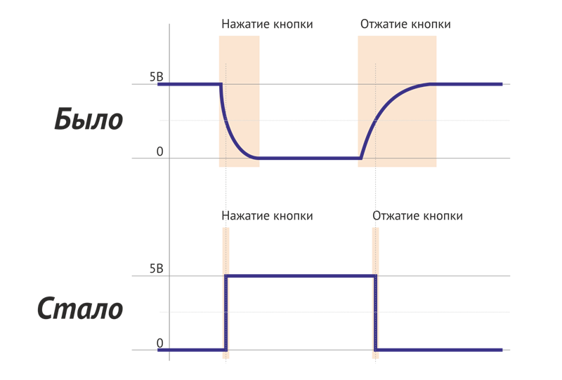 На самом деле смыкание-размыкание контактов кнопки в реальном мире немного отличается от того, как этого бы хотелось: |