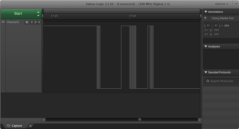 Логический анализатор Saleae Logic 16 нагляднее отображает дребезг из-за большей частоты сэмплирования: |