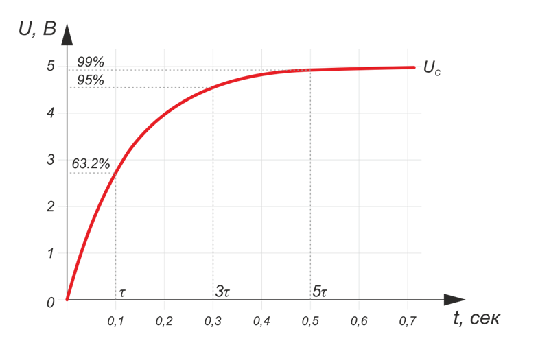 При замкнутой цепи и заряде конденсатора, напряжение $U_с$ на его выводах будет увеличиваться от нуля до значения $U=5 В$ по экспоненте: |