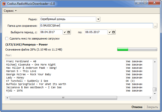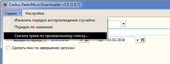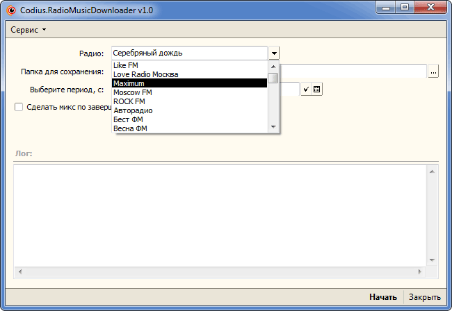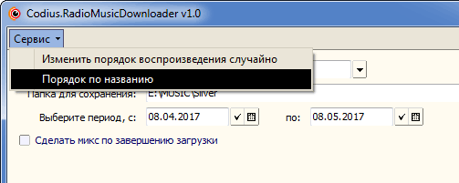 Часто бывает, что музыкальный репертуар любимой радиостанции не доступен за пределами самой радиостанции. Такая же проблема посетила и автора. Пришлось самостоятельно создать решение — была написана программа Codius.RadioMusicDownloader v1.0. Эта небольшая утилита позволяет скачивать музыку по плейлисту выбранной радиостанции. Также можно выбирать временной период, тем самым ограничивая рамки заданного поиска.