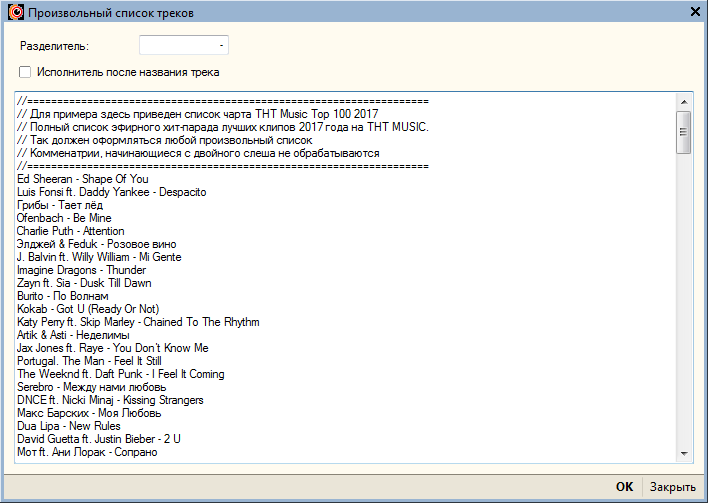 После выбора этого пункта меню, в появившееся окно нужно вставить список композиций, заранее подготовленный таким образом, чтобы каждый трек начинался с новой строки и у всех треков был одинаковый порядок (автор - название трека или название трека - автор) и одинаковый разделитель между автором и названием, например _-_ (минус с пробелами по краям). В качестве примера, в этом окне по умолчанию, содержится подготовленный список композиций TOP 100 по версии ТНТ Music за 2017 год: