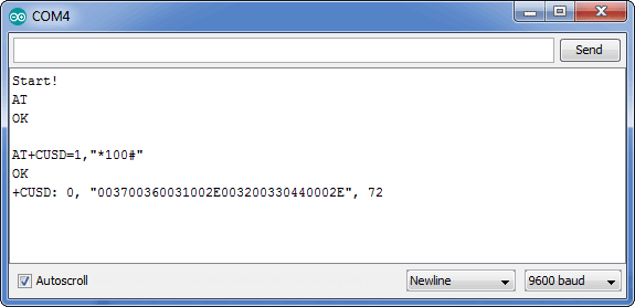 Исполнение команды, в случае корректного её исполнения, вернет ответ OK. Но непосредственно USSD-ответ будет получен в виде незапрашиваемого уведомления +CUSD. Именно его нужно отслеживать и обрабатывать, когда оно придет. Пример кода: |