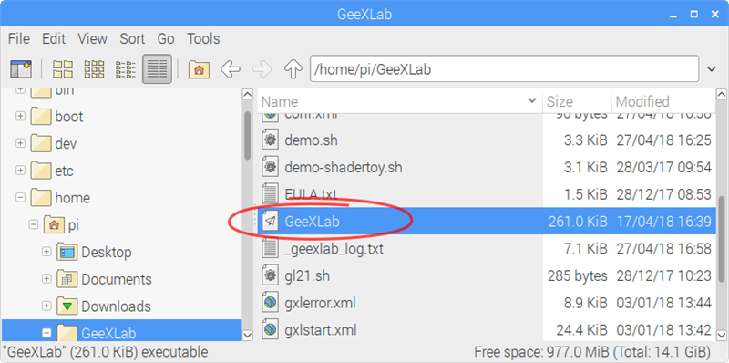 После перезагрузки, для проверки, в оконном интерфейсе двойным щелчком запустить файл GeeXLab (и выбрать Execute) в папке /home/pi/GeeXLab: |
