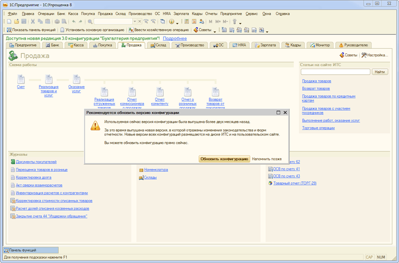 Чтобы убрать надоедливо запускающееся при старте окно о необходимости обновления конфигурации в 1С 8.2/8.3: