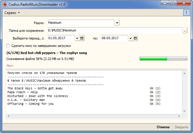 Часто бывает, что музыкальный репертуар любимой радиостанции не доступен за пределами самой радиостанции. Такая же проблема посетила и автора. Пришлось самостоятельно создать решение — была написана программа Codius.RadioMusicDownloader v1.0. Эта небольшая утилита позволяет скачивать музыку по плейлисту выбранной радиостанции. Также можно выбирать временной период, тем самым ограничивая рамки заданного поиска.