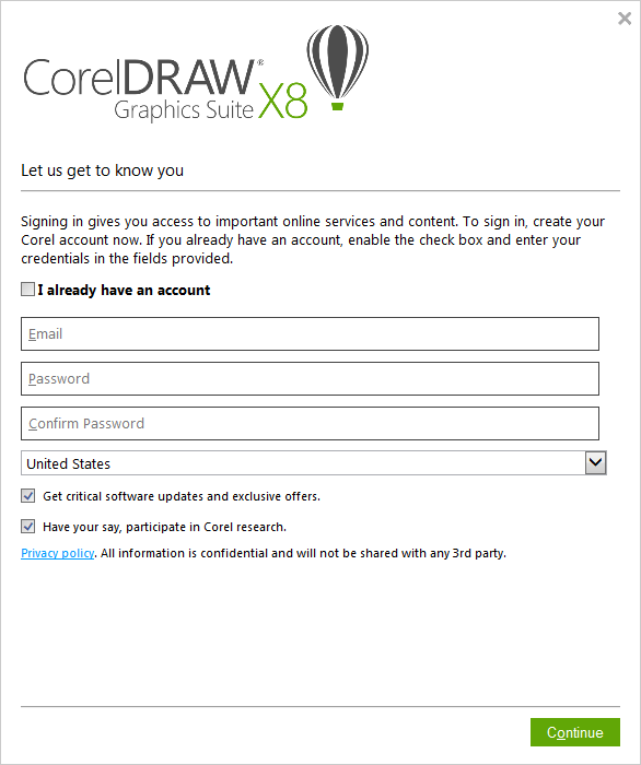 CorelDRAW Graphics Suite X8: Как убрать всплывающее при запуске окно об авторизации/создании аккаунта